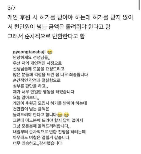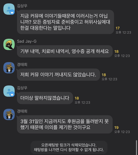 후원 계좌 환불 관련 오픈채팅방 오늘 폭파시킴