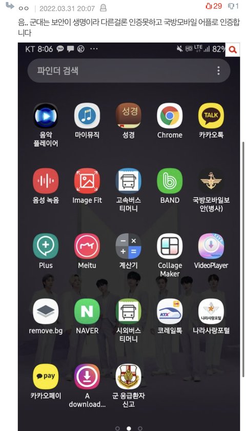 와우 폰 방금전에 불출받고 글을 지금봤는데 댓글이 60개가 넘게 달려있을줄은.. 응원의 말씀 다들 너무 감사드립니다 꿋꿋이 나라지키고 있을테니 방탄소년단 컴백할 때까지 모두 화이팅해봅시다!