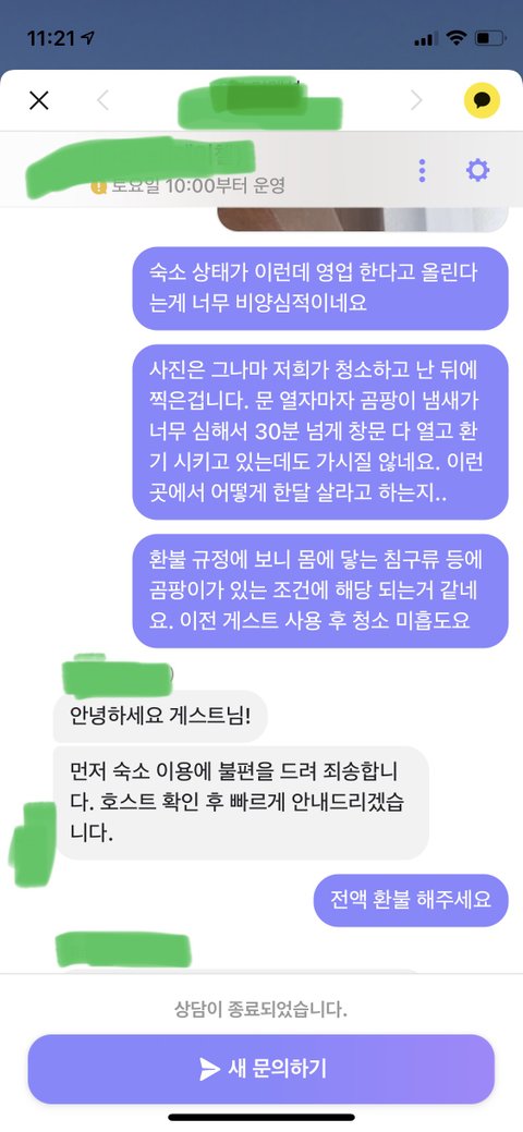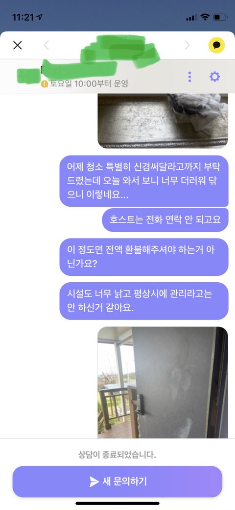 공용 세탁기 안에는 곰팡이 펴서 냄새가 너무 심하고 제가 너무 답답해서 여기 직접 와서 상황을 보시라니깐 자기는 내륙에 있어서 못 간답니다... 그리고 처음 제시한 25%은 자기 욕심에 그렇게 얘기했다고 말하더라고요. 다시 생각해도 너무 어이없고 괘씸하고... 정말 최소한의 책임감도 없는거 같았어요... 그냥 그런 분들은 제발 장사 안 하셨으면 좋겠어요... 정말로요.... 괜히 기분 좋게 제주도 오는 여행객들한테 폐 끼치지 말고요... 그리고 그 숙박업체 사이트도 주기적으로 직접 숙박 확인하고 올리셨으면 좋겠네요. 이렇게 문제 있을 때 책임지지도 않으실거면.... 숙박 담당 사이트 업체명과 숙박업명은 올리지 않았으나 여기 있는 카톡 내용 및 사진 보시면 그 본인들은 아시겠죠... (가린 부분은 상호명 나와 있는 부분입니다) 진짜 양심 좀 챙기세요. 계속 숙박업 하실거면 청소 좀 제대로 하고요. 정말 정말 더러워서 못 지내겠어요. 덕분에 저희는 그 날 당일 급하게 숙소 구한다고 생고생했네요.