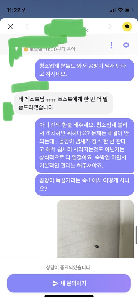 입실 2일 전에 특별히 청소 부탁드린다고 미리 연락드린 상태였어요. 부푼 마음에 제주에 도착해 숙소 문을 열었는데 정말 거짓말 안 하고 문 열자마자 곰팡이 냄새가 확 나는거예요. 마스크를 뚫고 들어올 정도로 너무 강력했어요. 그래서 일단 창문을 다 열어 놓고 환기를 시켰고 도대체 어디서 곰팡이 냄새가 나나 싶어서 방 안 이곳저곳을 확인 했습니다. 방은 원룸인데 복층 형식이고요. 숙소명은 혹시나 요즘 리뷰 나쁘게만 올려도 고소 들어온다길래 밝히질 못 하겠네요. 숙소 위치도 한적한 도로변이고 주변에 딱 그 숙소 하나 밖에 없어요. 정말 외관도 을씨년스럽고.. (숙박 사이트에 올라온 사진은 다른 느낌이였거든요..) 방 바닥이며 침대, 주방, 화장실 등 살펴 보는데 특별히 청소 부탁드린다고까지 연락을 드렸는데도 불구하고 여기저기 거미줄이며 먼지, 바닥에는 말라 비틀어진 밥풀 등... 도저히 청소를 했다고는 믿을 수 없을 정도였어요. 안되겠다 싶어서 일단 급한대로 물티슈로 닦아보니 시커먼 먼지가 묻어나오는데 순간 내가 왜 돈 주고 들어와서 이런 청소까지 해야 하나 싶은 생각이 드는거예요. 그리고 그 때 까지도 빠지지 않은 곰팡이 냄새까지.. 도저히 여기서는 못 지낼거 같아 방 상태를 사진 찍어 주인에게 보내고 전화하니 사과 한 마디 없이 청소업체 불러줄테니 상태 확인해 보겠다고 기다리라고 하네요. 그 사이 숙박사이트에도 카톡 상담으로 계속 항의하고 이 정도면 전액 환불 해주셔야 하는거 아니냐 했는데, 호스트(주인)와 연락하여 상황 확인한다는 답변 밖에 없더라고요. 결국 30분 넘게 기다린 후에 청소 업체 직원 2명이 왔고 청소를 해주시는데 도저히 곰팡이 냄새는 없어지질 않아서 호스트에게도 다시 한 번 더 얘기를 하니 곰팡이 냄새는 보내준 사진으로는 확인이 어려워 청소 업체 직원에게 확인을 해야 한다 합니다.. 아니 저희 말을 못 믿어서 그런건지... 그런데 오신 청소 업체 직원 분들도 곰팡이 냄새가 난다고 하셔서 그럼 호스트에게 전화하여 말 좀 해달라 하고 통화하는것도 확인 후 다시 호스트에게 전화하여 곰팡이 냄새 나는거 맞지 않냐 하니 우리가 청소업체 직원에게 그렇게 말해달라고 해서 그런거 아니지 않냐고 하시네요.... 이 때부터 너무 어이가 없어서 저희도 그냥 숙박비 환불 해 달라 하니 전액 환불은 절대 못 해준다고 하더라고요. 그래서 숙박 사이트 환불 규정에 보면 청소 상태 미흡 등 호스트에게 과실이 있는경우 환불 받을 수 있다하니 너무도 뻔뻔하게 자기들은 청소 업체 다시 불러주는 조치를 취했고, 청소는 업체에서 하지 자기들이 하는게 아니라고, 환불 안 해줘도 된다고 하더라고요... 청소업체를 불러주면 뭐하나요. 근본적인 원인은 해결 되지 않는데... 숙소 앞에서 호스트와 계속 통화하는 사이에 옆 방에 묵었던 다른 투숙객이 들어왔고 마침 얘기를 들으셨는지 자기들도 처음 왔을 때 청소가 전혀 안 되있고 여기저기 벌레며 먼지며 곰팡이 냄새가 너무 심했다고 하네요. 근데 숙박을 취소하면 당장 갈 곳도 없고해서 그냥 참고 참으면서 지냈다고 하시더라고요... 호스트에게 전액 환불을 재차 요구했지만 절대 못 해준다고 하여 제가 차근 차근 청소가 제대로 되어 있지 않아서 우리가 항의를 했고 환불을 요구하는거다 숙박업 하시면서 이런 기본적인 관리가 되어있지 않고 청소업체 탓하는게 아니라 최종 책임은 호스트 당신에게 있지 않냐 하니 그럼 숙박비 총 금액에서 25% 뺀 나머지 금액을 환불 해 주겠다고 하더라고요. 근데 아무리 생각해도 이건 아닌거 같아서 전액 환불을 계속 요구했습니다. 그러니 숙박 사이트 담당자와 상의 해본다 한 후 다시 연락이 와서 10% 을 제하고 환불 해준다고 하더라고요. 그 땐 저도 너무 지치고 화도 나고 해서 빨리 이 기분 나쁘고 더러운 상황을 끝내저리고 싶은 마음에 알겠다고 했는데 지금 다시 생각해보니 너무 괘씸하더라고요. 저희는 잘 못 한게 없고 호스트 의무를 다 하지 않은 사유로 숙박비 환불을 요구했는데 왜 위약금 10%을 우리가 부담 해야 하는지 이해가 되지 않네요. 그냥 먼지정도면 물티슈를 닦고 지낼 수 있습니다. 그런데 벌레가 나오고 거미줄이 쳐져 있고 먼지와 말라비틀어진 밥풀이 뒹구는 집을 어떻게 청소 했다고 당당히 말하는지... 심지어 호스트에게 그 사진을 카톡으로 다 전송했는데도 자기들은 청소 했다네요?