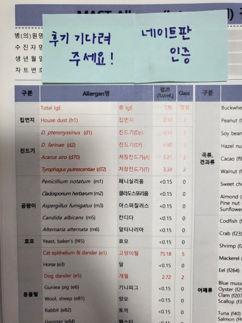 검사에서 알러지 정도도 표시되는데 고양이 알러지는 알러지 약을 복용해도 효과없는 정말 최극상이라 미리 약을 먹는다고 예방할 수 있는게 아닌 예방자체가 불가한 생명의 위협이 있는 상태입니다
