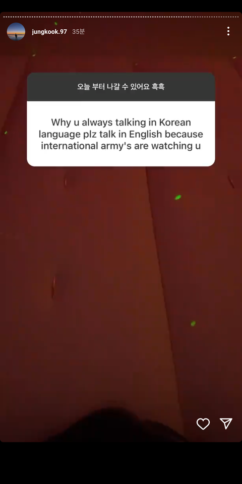 한국인인데 한국말 하지; 지가 한국어 못 한다고 왜 영어 안 써준다고 지랄 근데 또 착한 정국이는 자기도 영어 잘 하고 싶은데 잘 안 된다고 답 해줌..