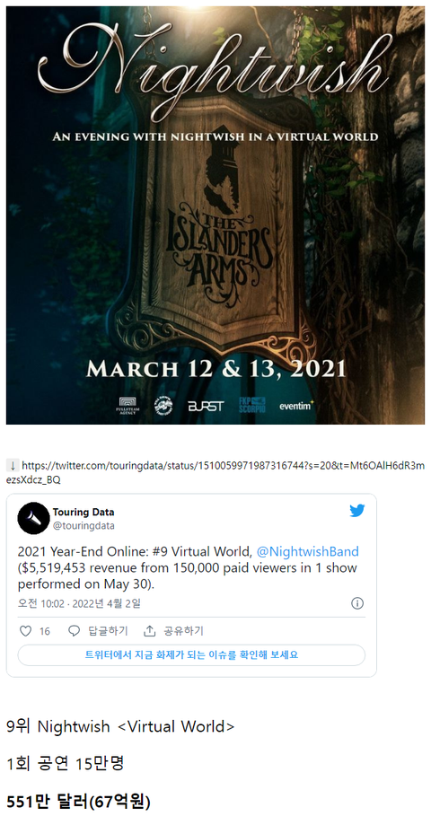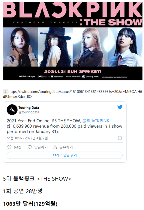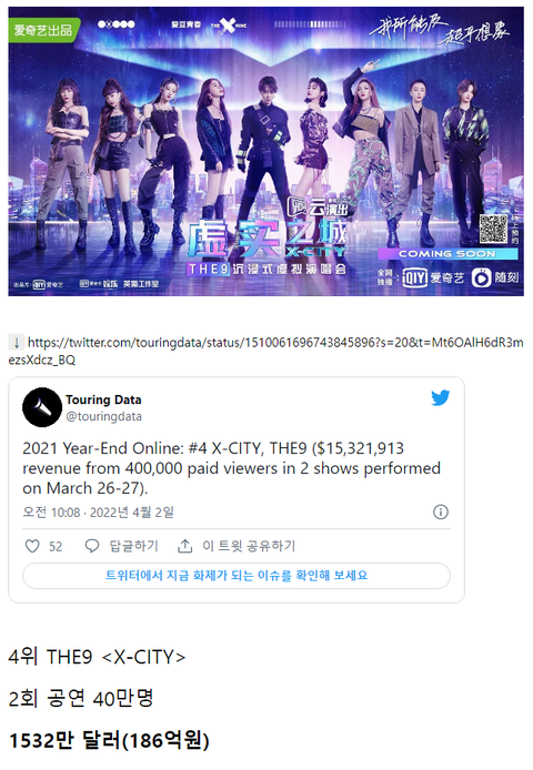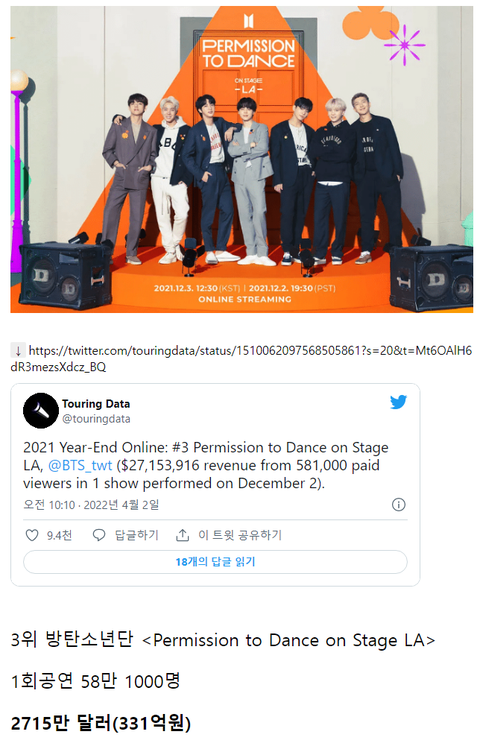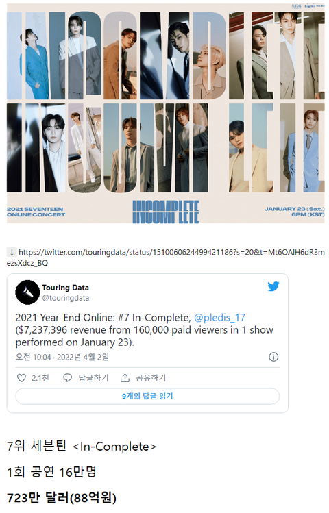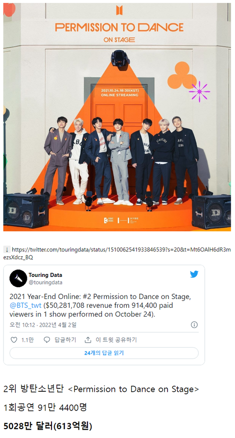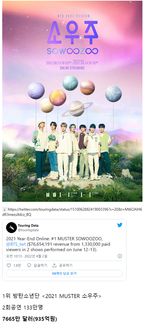 1위 방탄소년단 소우주 온라인 팬미팅 935억원