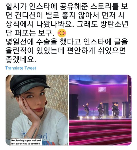 컨디션 안좋은데 애들 무대 챙겨보고 우리도 보라고 올려준듯ㅠㅠ고마워요 명예 아미