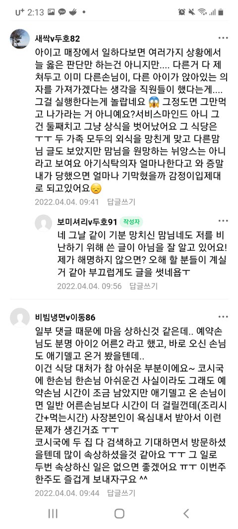 미리 예약하고 온 손님께 아기의자를 내줘야한다고 생각한게 사장님 생각이었던거고.