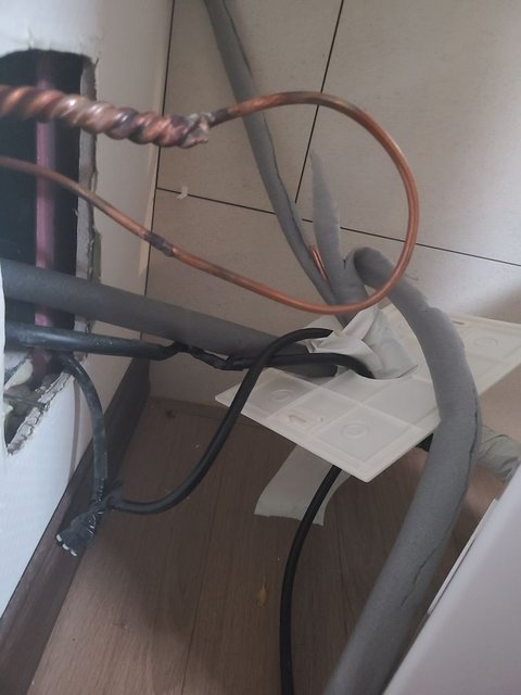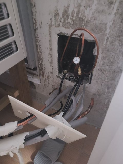 현재 저희집은 벽면에 에어컨을 설치하느라 뚫어놓은 상태 그대로 있고 에어컨 기계는 바닥에 널부러져 있습니다.