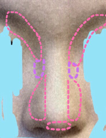 그 다음에 두번째 컬러로 핑크색+보라색 부분에 전체적으로 콧대 모양잡으면서 한두번 발라줘 코아랫부분에도 마찬가지 !