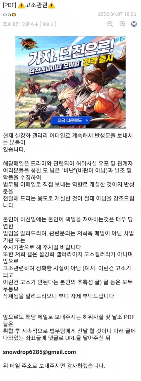 쟤네 ㅈㄴ 추한게 날조글 싸지를때는 당당했으면서 고소후기 올라오니까 설강화갤 피뎁수집 메일로 반성문 보내고 있대ㅋㅋㅋㅋ 당당함 다 사라졌네 추하다 추해