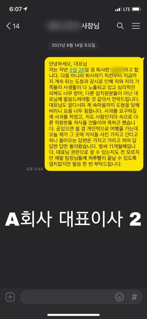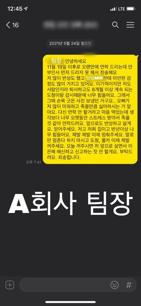 - 그러나, 내가 지속되는 소리로 자살 시도 후 대표이사 두 분께 소리를 꺼주시라는 연락을 드리고, 담당 MD님께 죄송하다는 사과연락과 이제 그만 해달라는 연락을 드리고, 팀장님께 손목 긋은 사진과 함께 전화를 드리자 전화는 받지 않고 사진은 읽씹 하시고 그 후 연락은 오지 않길래 며칠 뒤 다시 너무 힘드니까 그만 해달라고 연락을 드렸으나 모두 읽고 답이 없으심.