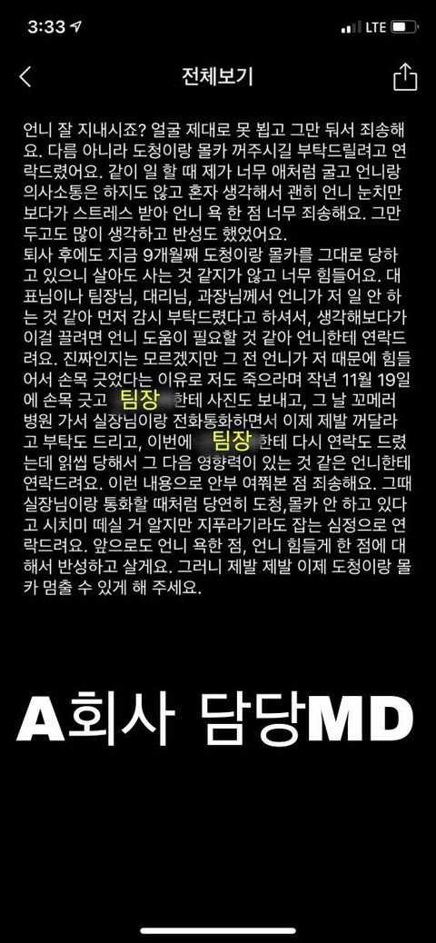 - 그 다음은 트러블이 있던 담당MD와 관련된 소리였음. (지방에서 혼자 서울에 올라와 일하는 상황이였는데, 엄마랑 휴일에 전화하다가 담당MD가 매출 압박을 많이 준다, 스트레스 받는다고 말한 적이 있음.) 너 엄마랑 전화하는 거 다 들었는데 왜 담당MD 욕 하냐, 양심도 없냐, 너 때문에 담당MD 죽었다 등등