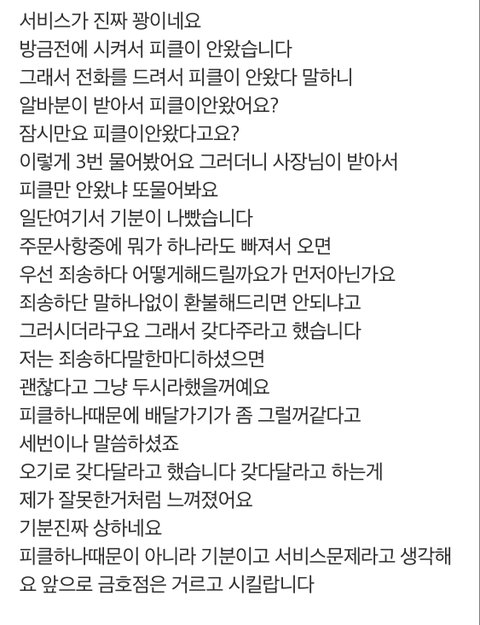 "피클만 안왔다구여 몇번을 말해요"