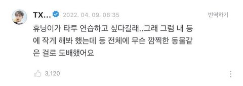 이 다정남한테 매일 치이는 거임.. 아무리 꿈이래도..타투 연습 하고 싶다고 자기 등을 내줘….타투 평생 가는데..못 지우잖아..연습이면 삐뚤빼뚤 그릴 확률 100%인데.. 연습하고 싶다니까 자기 등에 작게 그리라는..머리 아프다