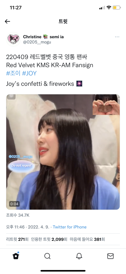 너네가 하도 지랄해서 저 영통한 팬분이 뒷영상 풀었네ㅋㅋㅋㅋ응원하고 사랑한다고 말하는거 조이 끄덕끄덕 들어주다가 자기도 사랑한다고 볼하트 해주고 웃는데