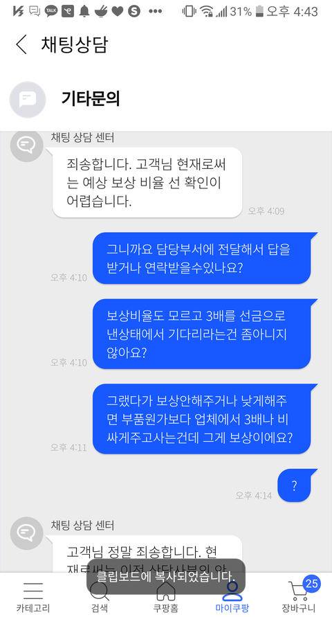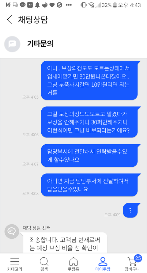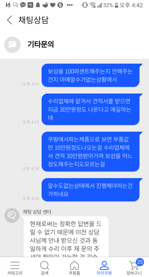 그래서 전 보상이 100프로 보상인지아닌지 보상을 안해줄수도 30% 50%만 해줄수도있는 명확한 보상비율을 알수없게하는 고객센터와 ㅋㅍ회사시스템만을 말만믿고 보상을 받으려면 부품가격의 3배가량되는 업체수리를 선금으로주고 견적서를 내야되는겁니다...