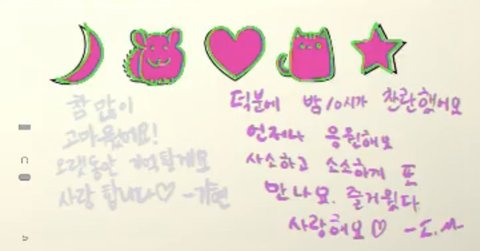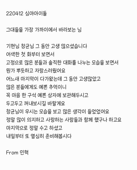 (아무것도 안 할 것 같이) 숙소에서 피자먹던 둘째는 [그대들을 가장 가까이에서 바라보는]이라는 닉네임으로 이렇게 편지도 써주고