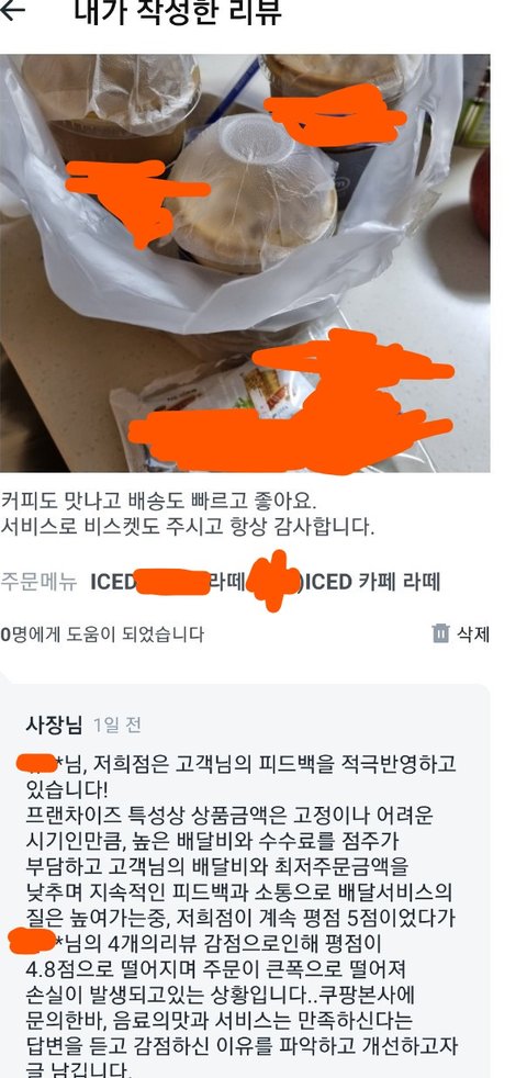 이런식이라면 쿠팡 / 업주 리뷰 조작하는거 아닌가? 본인은 비방, 폄하 내용 1도 없는데...단지 별 때문에 게시 중단 되는거 보면, 그리고 본인도 배달 주문시 별점/리뷰 토대로 하는데...가끔씩 이게 왜 평점 5? 4.8??인지 이해가 안 되는 음식들이 있었는데.... 이래서 였네요...함
