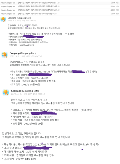 - 4/08(금) 18:32 쿠팡에서 리뷰게시중단 문자 옴