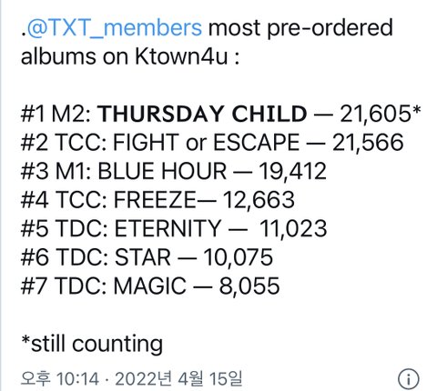 다른 앨범들은 다 총 선주문량인데 떨차 이틀치 선주문량으로 1위했어
