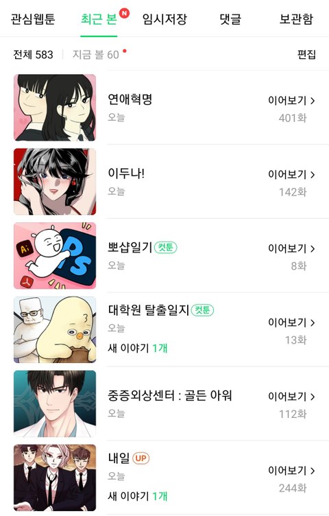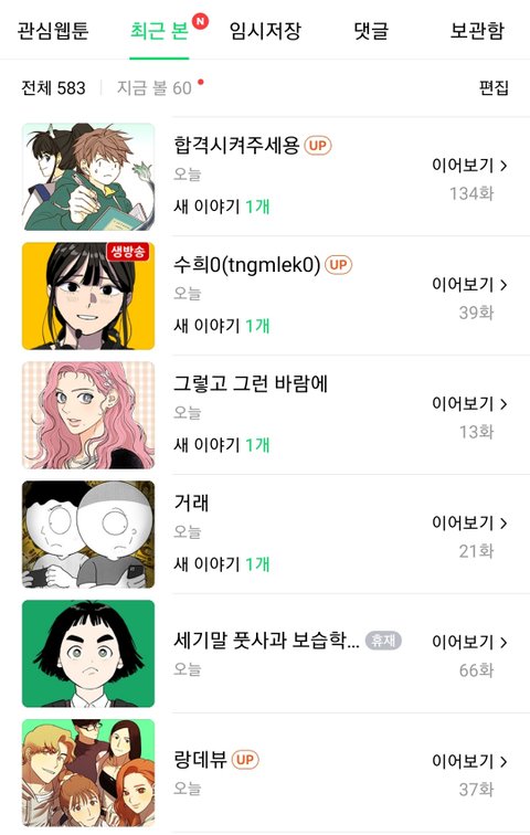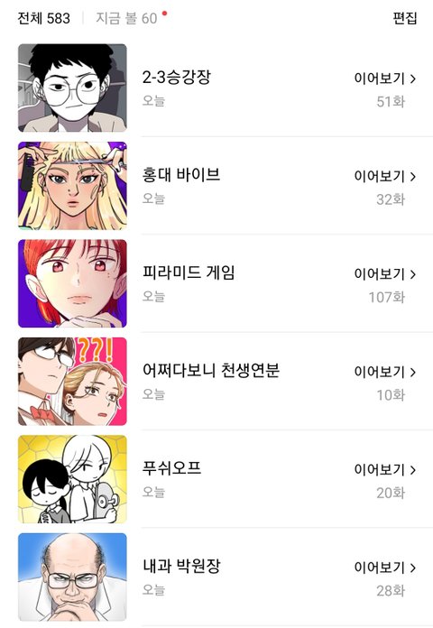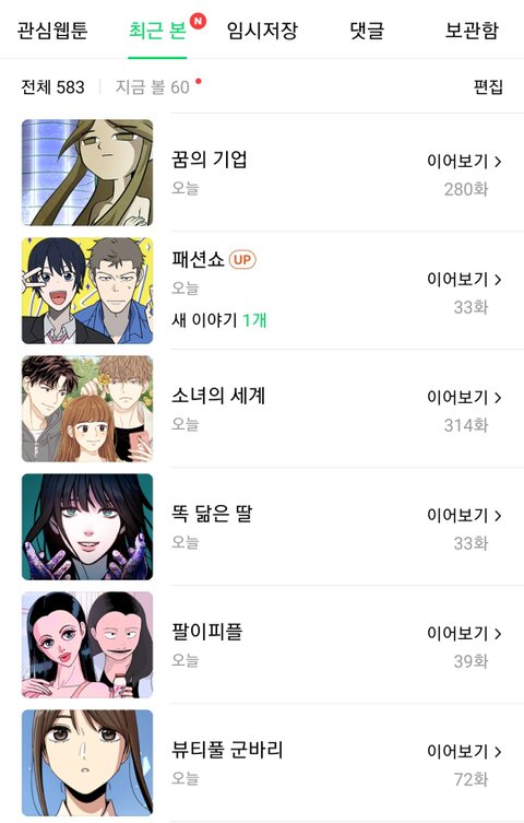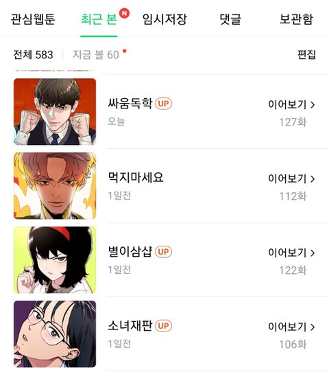 나랑 취향 비슷한사람 있으면 여기 웹툰들이랑 비슷한 다른웹툰도 추천좀 해조... 요즘 볼꺼 진짜없음 특히 화요일 수요일에