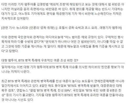 보시다시피 어떤 기획사도 미팅을 요청하지 않았다. 그들을 초청한 것은 정부 관계자였다. 또한 그것은 큰 기획사 소속의 아티스트에게만 국한된 것이 아니라 전체 산업에 관한 것이었다. 또한 그것은 군 면제에 대한 것이 아니라 군 복무 지연에 관한 것이었다