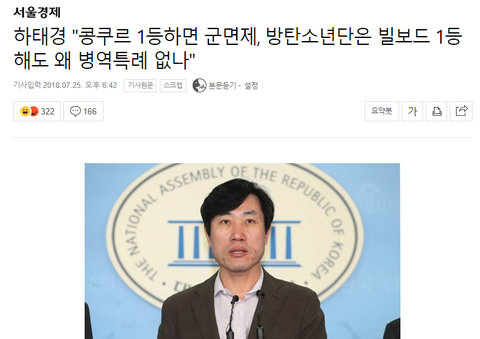 ***우선 2018년 7월 활동가이자 정치인 하태경이 방탄소년단이 빌보드 차트 1위를 차지한 만큼 군 면제를 받아야 한다고 발언했다.