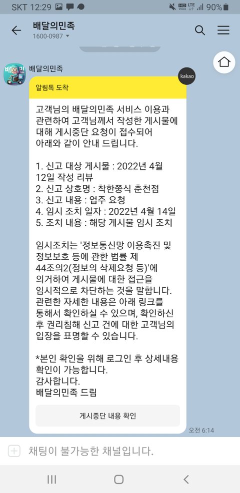 그냥 지나칠까 하다가 개인적인 느낌을 리뷰를 올렸습니다 혹 낮은 별점으로 업주님께 펴가 될까싶어 별다섯개 드리면서 작성했습니다 며칠후 배민에서 톡이 왔습니다 업주의 요청으로 리뷰가 일시 삭제되었으니 한달후에 다시 게재되기를 원하면 신청하랍니다 아무래도 이건 아닌것같아 고객센터로 전화를 했더니 배민측은 전혀 관여하지 않는 일이고 법적책임도 없고 정상적인 방법을 통해 진행한것이라는 답변만 앵무새처럼 되풀이합니다