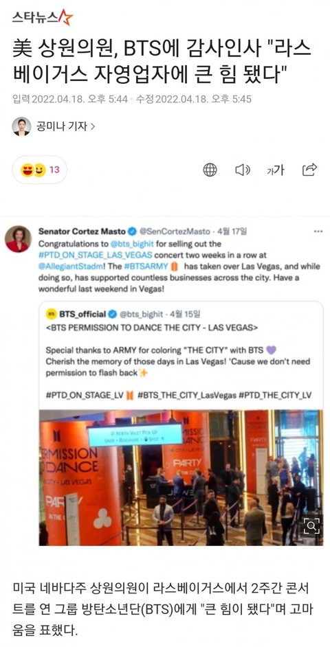미 상원의원 BTS에 감사인사 "자영업자에 큰 힘이 되었다"