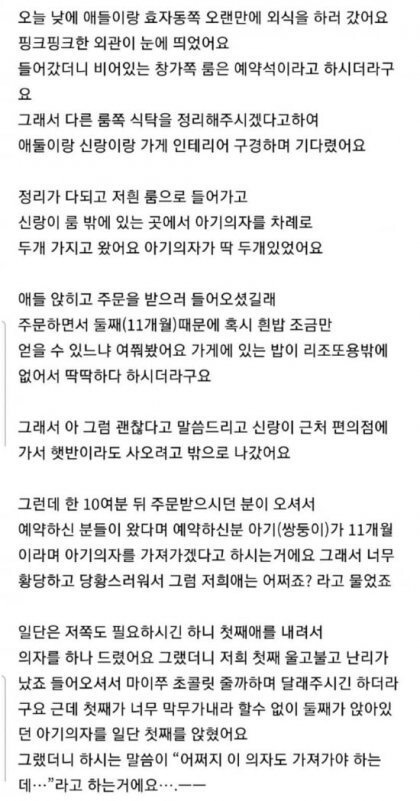 4. 가게측에선 예약된 아기의자를 b손님이 가져가서 쓰고있는걸 보고 예약된거라며 죄송하다고 사과하고 가지고옴