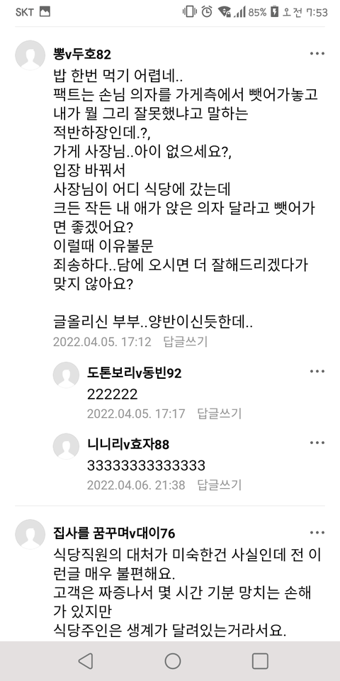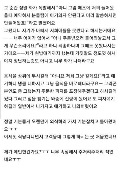 5. 윗 상황에 기분이 나빴던 b손님은 음식이 나왔지만 화를내며 계산하지않고 나감. 이후에 맘카페에 해당식당 상호명 공개하며 저격글올림