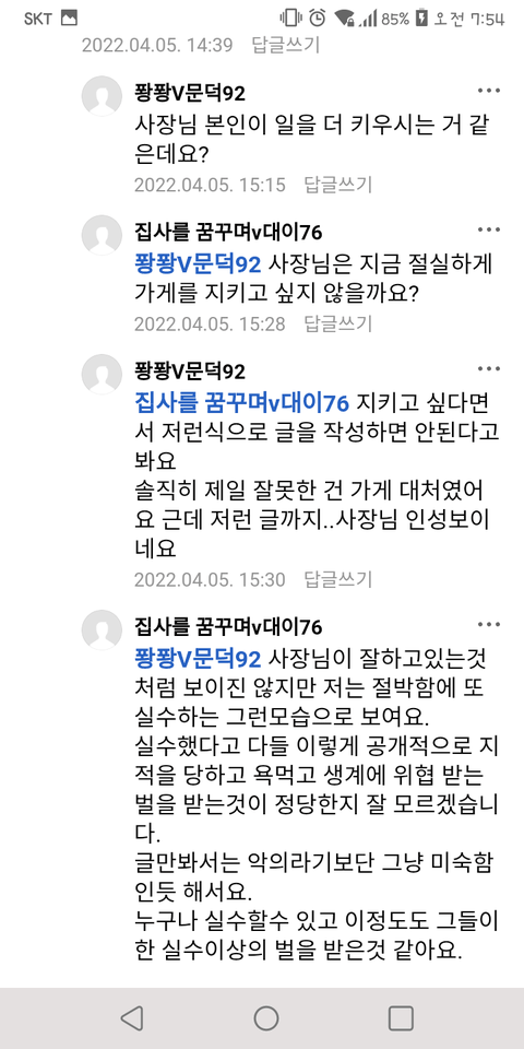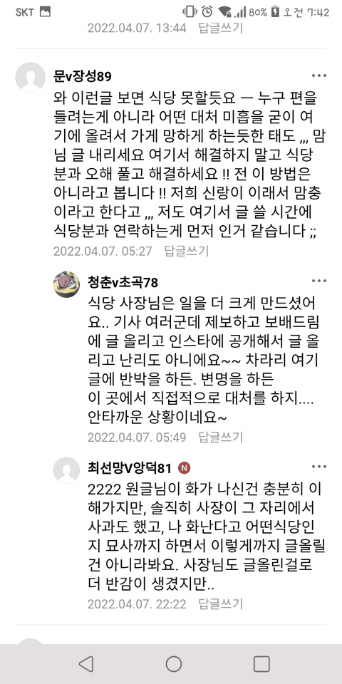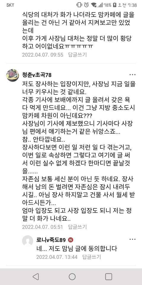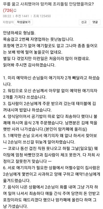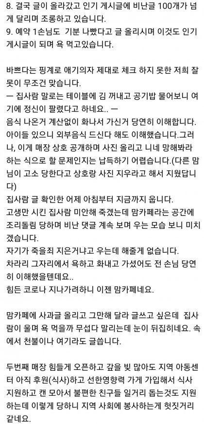 6. 해당 맘카페글은 인기글로 올라가며 식당 욕먹고 난리남. 사장님은 보배드림에 글씀.