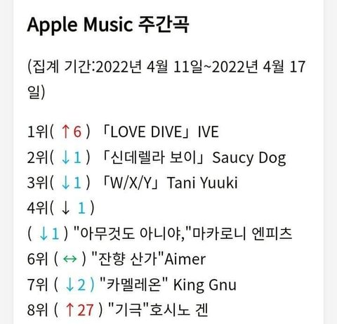 이게 얼마나 대단하냐면 일본의 애플뮤직=우리나라의 멜론점유율 2배ㅇㅇ멜론에서 저스틴비버의 stay가 1위한거랑 같은 맥락..아직 데뷔 5개월차라 일본팬덤이 탄탄하진 않지만 관심도는 엄청 높음..애플뮤직뿐만아니라 유튭뮤직이나 스포티 라인뮤직도 다 1위임