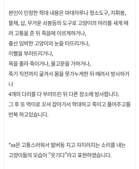 난 간단한 해부도 하거나 볼 수 있고 잔인한 영상보고도 크게 동요하는편은 아님 근데 인스타가서 고양이 학대하는거 보니까 저게 사람이 할 짓인가 싶어서, 그리고 혹시 심신 약한 사람은 영상 보지 말라고 써봐