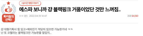 아득바득 틈만 나면 블핑 까려고 드는 판보면 ㅈㄴ 웃김ㅋㅋㅋㅋㅋ코첼라 최초로 갈때도 듣보 축제취급하더니 또 그 회사빨 얘기ㅉ 다른 대형 아이돌들은 소속사가 그렇게 밀어주는데도 왜 니들 말대로 주식 망한 블핑만큼 못뜨는지 알려주실분? 블핑 3세대 여돌인데 2년째 컴백 안해도 웬만한 4세대 탑여돌들 만큼 허구한날 후려치기 당함ㅎ