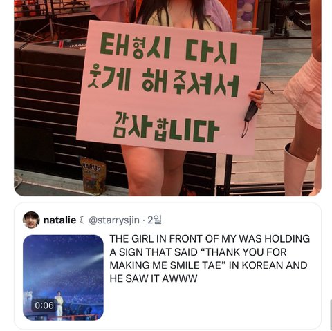 외국팬이 든 피켓보고 뷔가 계속 웃으라고 제스춰 해준걸