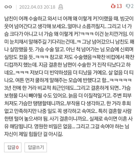 현재 가슴수술한지 3년정도 됐구요~ 저도 굳이 남의 시선에 보기 좋으라고 수술을? 이런 생각으로 20대를 보내다가 33살에 샤워하고 전신거울 보는데 참 뭔가 현타가 ㅋㅋㅋㅋㅋㅋㅋㅋㅋ 그래서 충동적으로 바로 예약하고 한달만에 수술했어요~ 지금 재료에 대한 아쉬움과 좀더 크게 할 걸 이라는 아쉬움이 남지만 만족해요~ 남의 시선에 대한 만족으로 수술하려는 것보다 진짜 본인 만족이 가장 와닿고 큽니다~~ㅎㅎ 저는 겨드랑이로 했는데, 주름에 맞게 절개해서 흉도 없어요! 성형에 대한 생각은 다들 케바케라.. 일단 전 결혼 앞두고 있는데 남자친구는 수술한거 알아도 가슴 너무 이쁘다고 좋아라합니다~ㅎㅎㅎ