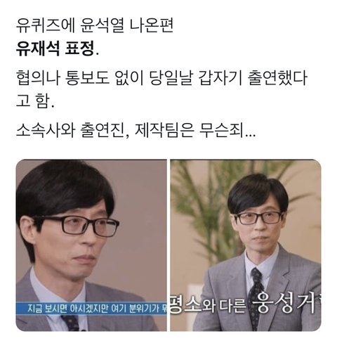 사전 합의 없이 대통령이 들이닥치는데 안 당황할 사람이 어딨냐고... 심지어 유재석은 사전 조사도 철저하게 해서 질문하는 사람인데 이렇게 막무가내로 출연하면 어캄
