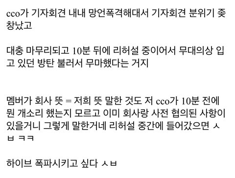 병역 문제는 회사에 일임하겠다는 한 멤버의 대답은 정말 원론적으로 한 거다. 자신의 의견을 내보이기에는 너무 위험한 자리였고 "회사의 입장이 아마도 우리 입장인것같습니다." 라고 할 수밖에 없었다. 하이브 총괄보다 멤버가 더 원론적으로 말하는 게 말이냐 되냐. 멤버는 그냥 회사를 믿었을 뿐이다.