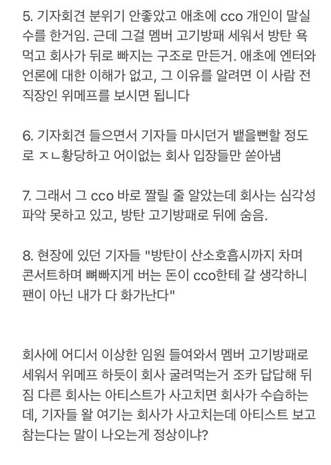 오죽했음 기자들이 하이브 ㅈ같아서 기사쓰고 폭로하고싶은데 방탄이 너무착해서 혹시라도 방탄한테 불똥튈까봐 참는다잖냐ㅜㅜ 예전부터도 소속사는 ㅈ같아도 애들이 착해서 다들 넘어가준게 많음.. 아 빅히트로 남지 하이브.. ㅅㅂ