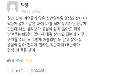 그리고 교외근로와 기타 여러 일로 인해 바쁜 자신과 다르게 저는 무기력하게 하루종일 누워있으니 별로 힘들어보이지 않는다고 말합니다.