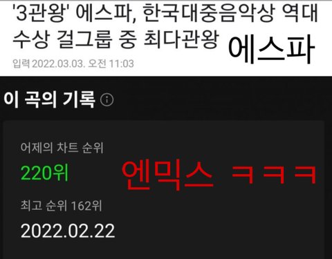 엔믹스 망돌 시녀년들 여기서 에스파 머리채는 왜잡아 ㅋㅋㅋㅋㅋㅋㅋㅋ 현실 보여줘? 느그 망돌이랑 비벼지지도 않는데 왜 니들만 에스파를 라이벌로 생각해 ㅠㅠ