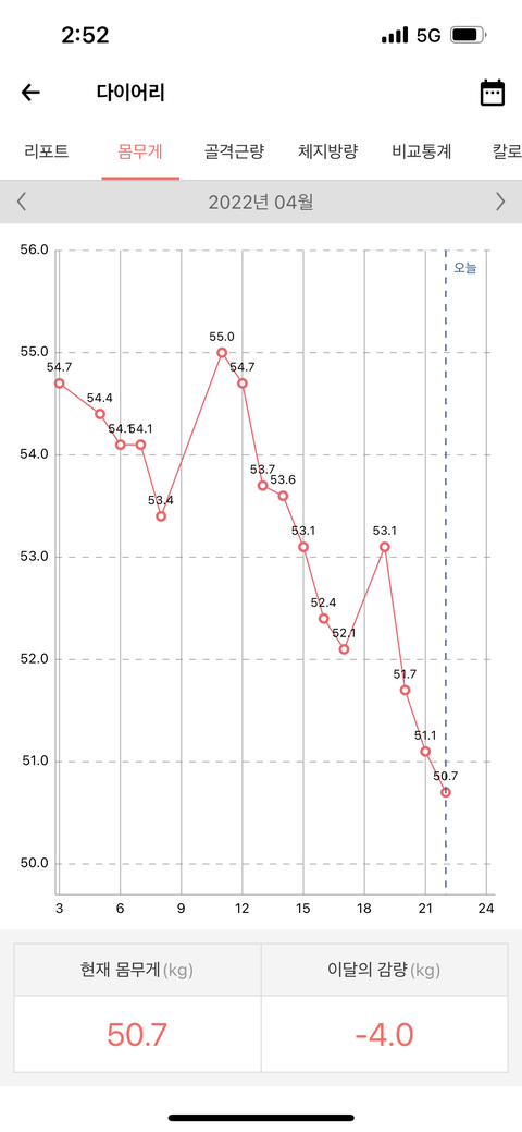 73키로로 시작해서 오늘재니까 드뎌 50키로 찍었더라
