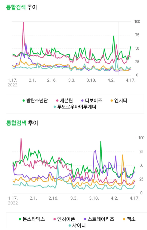10대들이 가장 많이 검색한 남자아이돌그룹(12세~18세)1위 방탄소년단2위 세븐틴3위 더보이즈4위 엔시티5위 투모로우바이투게더6위 몬스타엑스7위 엔하이픈8위 스트레이키즈9위 엑소10위 샤이니