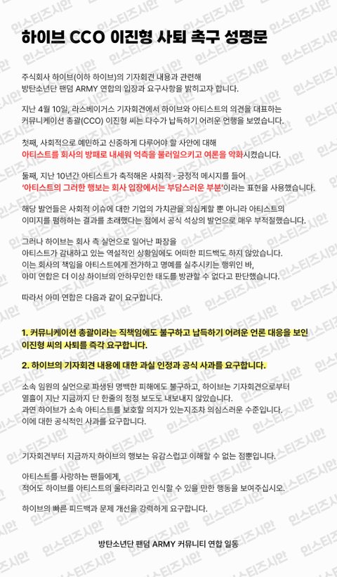 3. 무엇을? 기자회견 사태에 관한 하이브 커뮤니케이션 총괄 이진형의 사퇴요구를