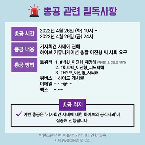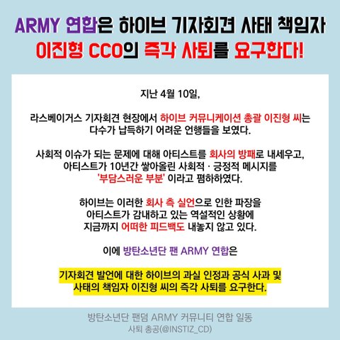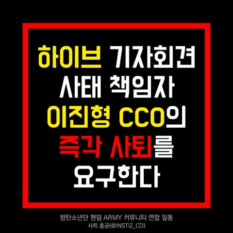 본 총공은 기자회견 사태에 대한 하이브의 공식사과 및 하이브 커뮤니케이션 총괄 이진형의 사퇴 요구에 집중해 진행됩니다.