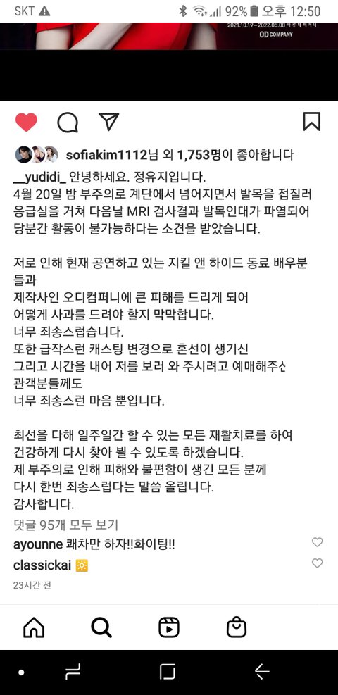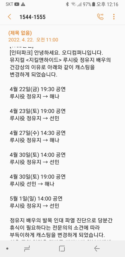 ㅠㅠㅠㅠ 나 뮤지컬 지킬앤하이드 유지루시 회차 보려고 예매했는데 유지님 발목 다치셨대ㅜㅠㅠㅠ