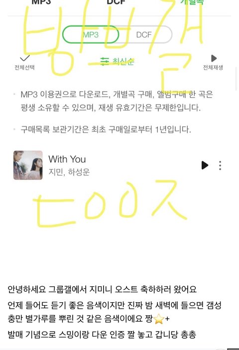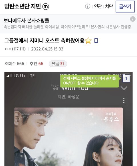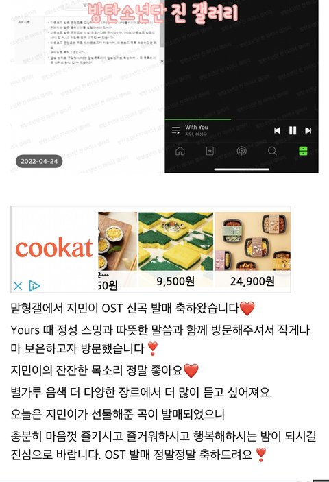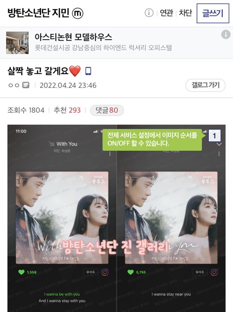 그룹갤이랑 진갤에서 지민이 ost 발매 됐다고 지민 마갤가서 스밍이랑 다운 인증 짤 들고 축하해줌 ㅠㅠ 정국갤에서도 왔던데 하 우리팬덤 너무 따뜻해..