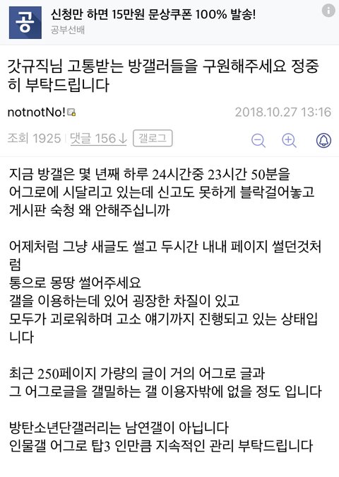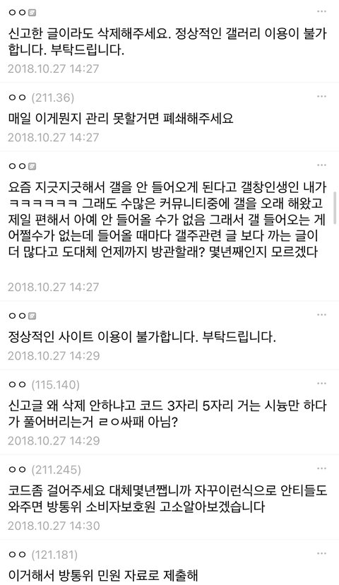 방탄갤에도 유입들 엄청 쏟아졌었거든 아마 그때부터 갤러리 방어가 좀 되기 시작했었던 것 같아 근데 그때도 사람들 글밀하고 신고하고 노래가사로 도배하고 아주 힘들어했음 ㅋㅋ