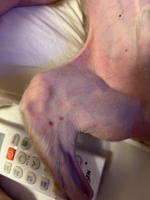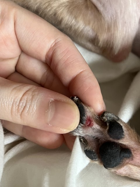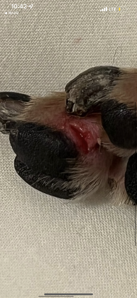 봤더니 상처가 있었습니다. 발톱을 보니 원래 곰팡이가 있던 두꺼운 발톱이 조금 날카롭고 살점같은게 붙어 있어서 발톱때문인가 생각하면서 사장님한테 사진을 보냈어요.