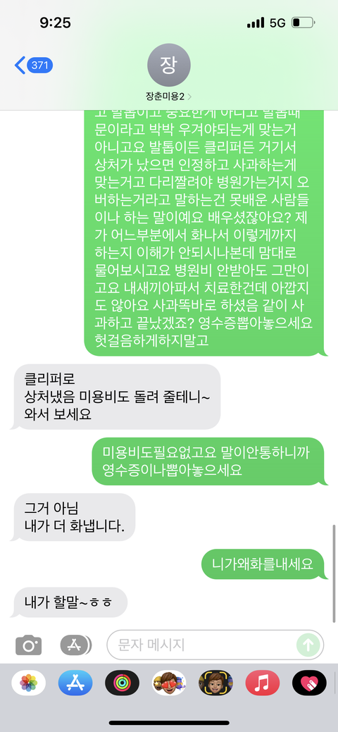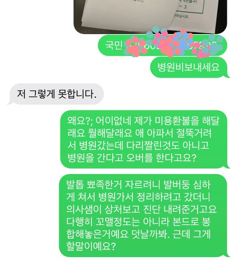 사정 설명을 하고 의사샘이 상처를 보시더니 클리퍼에 의한 상처같다 뭐 여러가지 원인이 있겠지만 발톱때문은 아닌 것 같다 꼬매기엔 애매하니 본드로 봉합을 해주겠다 하시고 간호사샘도 견주님이 하셨냐고 미용실에서 했다하니 미용실에서 했다고요? 하며 말씀하시더라고요...(애기가 자꾸 핥고 피부발진도 올라와서 다시 다른 병원에 방문했을때는 발톱이 찔러 생긴 상처의 위치가 아니다라고 하셨어요) 그래서 사장님께 클리퍼때문이라네요 병원에서? 라고 문자하니 전화가 와서 어디병원이냐 병원을 왜 갔냐 하시길래 강아지가 발을 절뚝이면서 아파해서 왔다하니 병원을 왜 가냐 재차 얘기하셔서 당연히 강아지가 아파하니 병원을 왔지 왜 가냐고 왜 물어보시는거냐 하고 싶은 말이 뭐냐 했더니 제가 하고싶은 말은 연고 바르고 뒀다가 심해지면 병원을 가지 다리가 짤린것도 아닌데 병원까지가서 오버하시네요 하시는데 진짜 화가 났습니다.