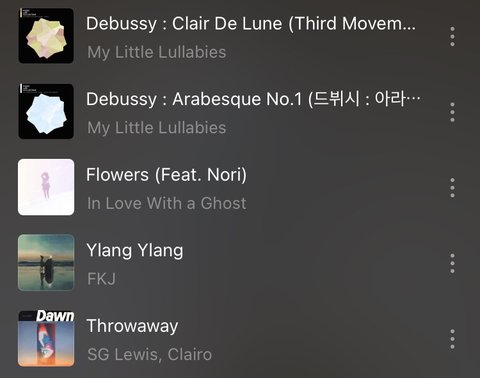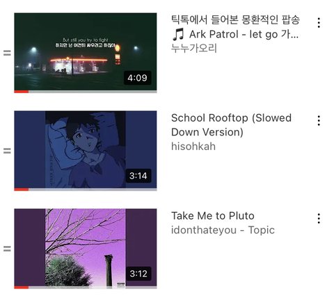 노래 입맛 개까다로워서 좀만 별로여도 플레이리스트에 안 넣음 진짜 power 몽환!!!!인 노래만 넣었어 듣고 있으면 내가 어딘가 구름 가득한 환상에 있는 느낌임 ㅜㅜ 몽환의 숲 이런 느낌 저거 유튜브 3개 노래는 꼭 들어봐야 함 진짜 ㅈㄴㅈㄴㅈㄴ 몽환적이고 개좋은데 멜론에는 없어서 유튜브로만 들어야 함… ㅜ하 암튼 꼭 들어보ㅏ 나만 알고 싶엇는디 몽환적인 노래 조아하는 애들도 들어보라구 공유함